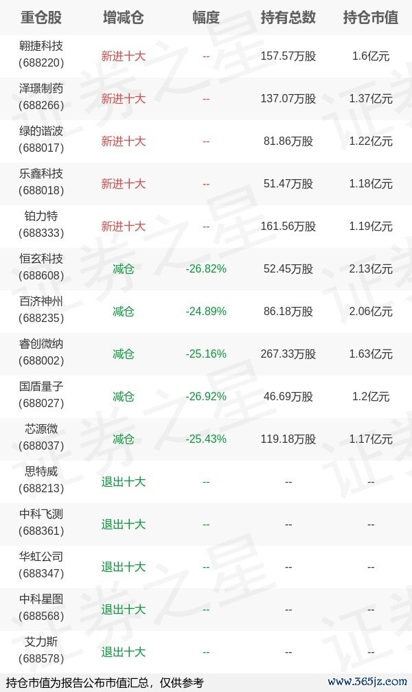 本站消息,4月22日博时基金旗下唐屹兵管理的博时上证科创板100交易型开放式指数基金公布一季报,近1年净值增长率29.18%。与上一季度相比,该基金前十大重仓股新增翱捷科技,泽璟制药华霖资本,绿的谐波,乐鑫科技,铂力特;其中恒玄科技持仓占比3.4%,为该基金第一大重仓股;思特威,中科飞测,华虹公司,中科星图,艾力斯等退出前十大重仓股;详细数据如下: